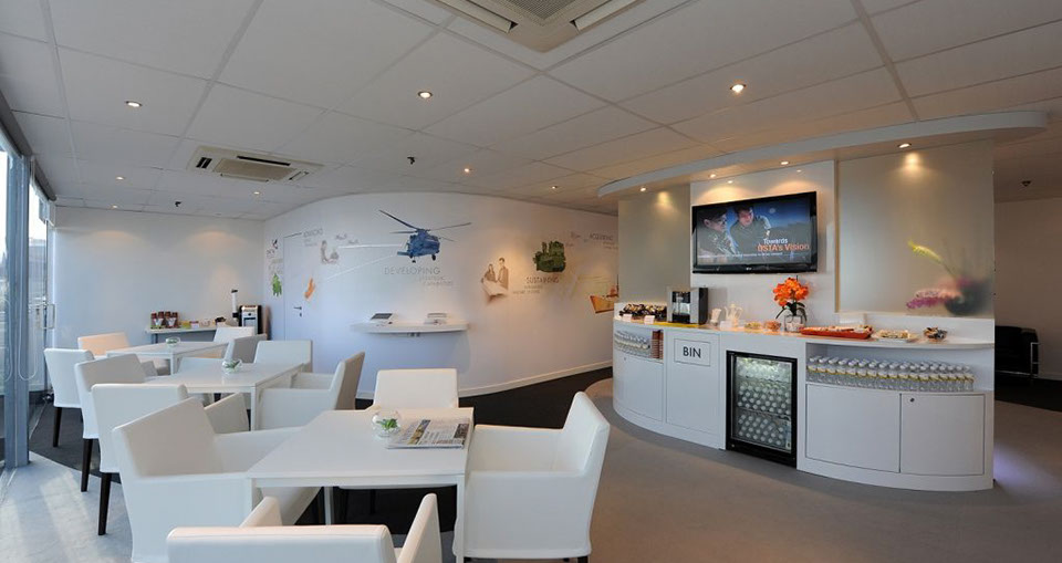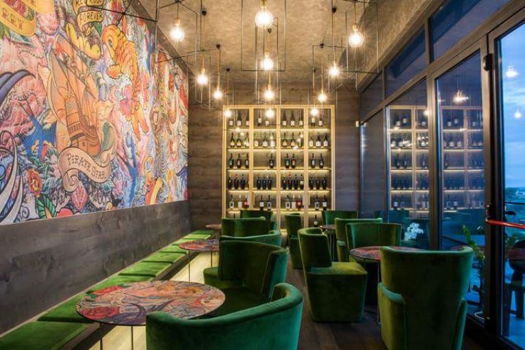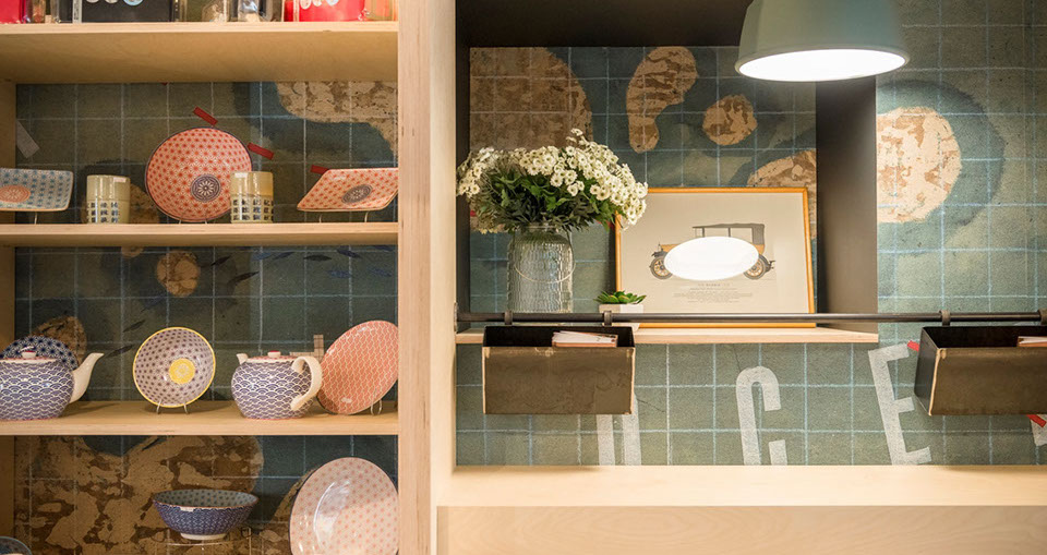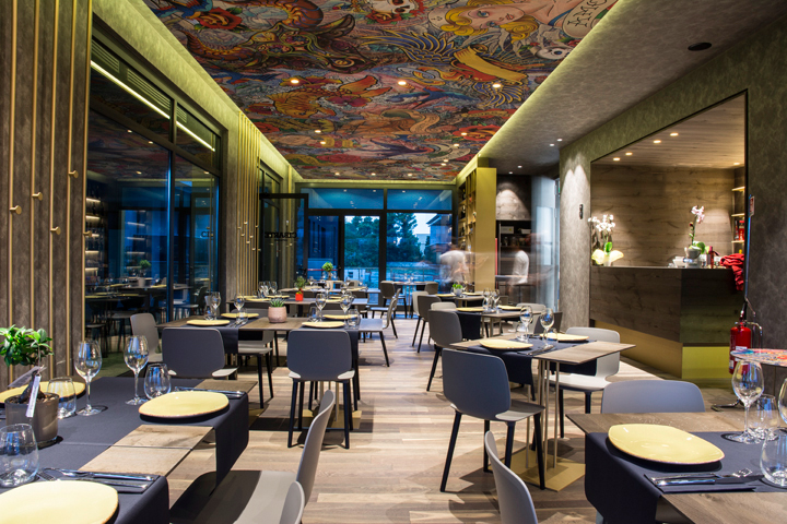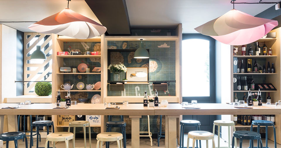 Set in an informal sushi restaurant in Europe, the wallpaper ""Fly way"" is a map of islands in the middle of the ocean, where the dominant green of the water constitutes a subtle reference to the fish-based menu.